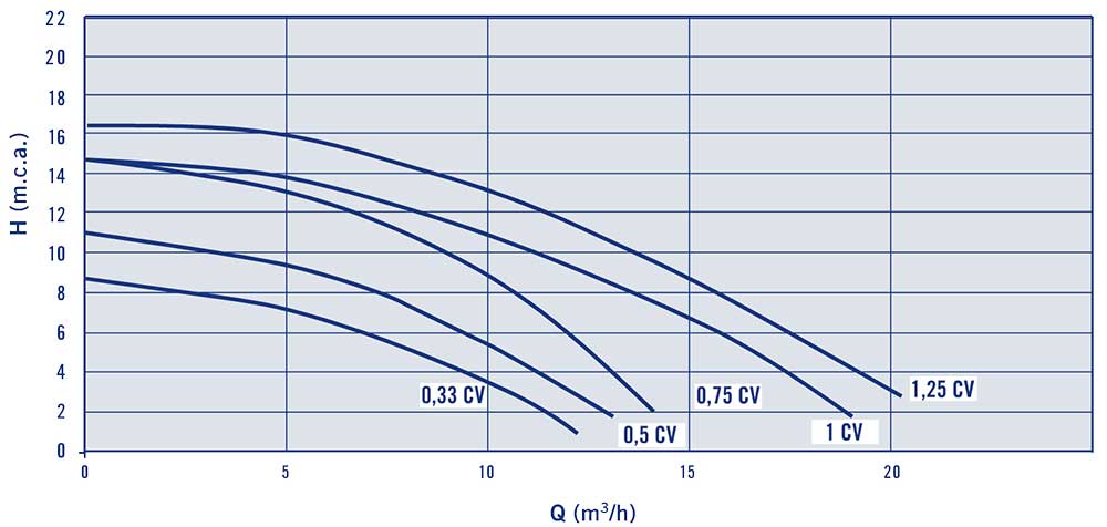 | Alaska – 1,25 HP | 14.000 l/h | 1,25 HP | 230 V – Mono | 0,04 m3 | 13,0 |