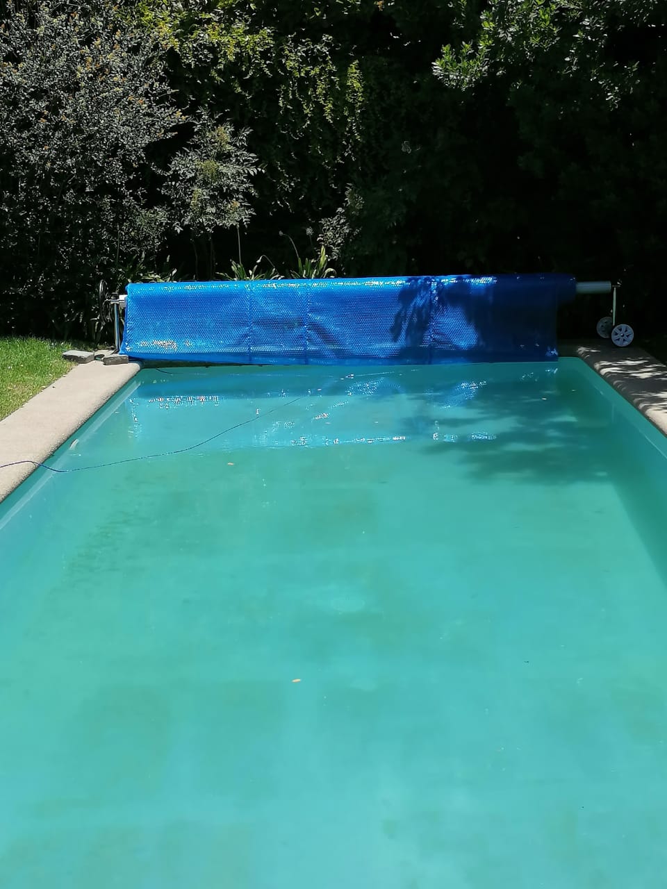 COBERTOR TÉRMICO (manta térmica) : Cobertor o manta térmica para piscina de plástico con burbujas, color azul, espesor 220 micrones, con tratamiento anti-UV y anti-hongos, son 4090 burbujas por m², confección nacional. Cobertor flota sobre el agua, orientado para mantener temperatura de piscina,